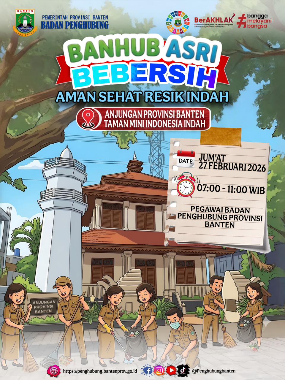 Mengikuti Arahan Presiden Republik Indonesia mengenai Gerakan Kota Asri “Aman Sehat Resik Indah“ dan juga mengikuti Instruksi Gubernur Banten tentang Himbauan Gerakan Jumat Bersih, makan Badan Penghubung Provinsi Banten akan menggelar kegiatan beberesih kembali di Anjungan Daerah Provinsi Banten Taman Mini Indonesia Indah pada Jum'at, 27 Februari 2026.