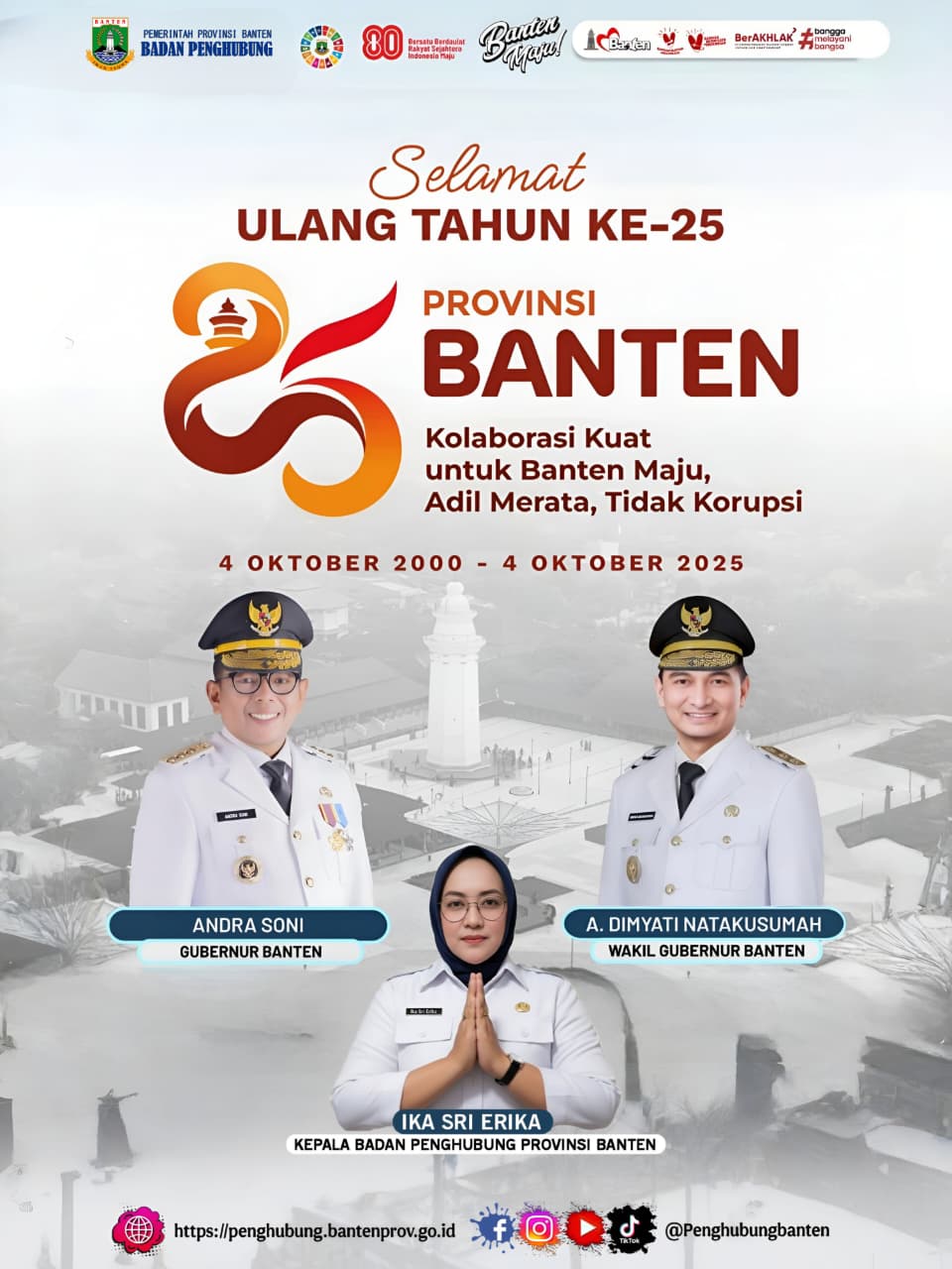 Selamat Hari Jadi ke-25 Provinsi Banten 4 Oktober 2000 - 4 Oktober 2025 "Kolaborasi Kuat untuk Banten Maju, Adil Merata, dan Tidak Korupsi"